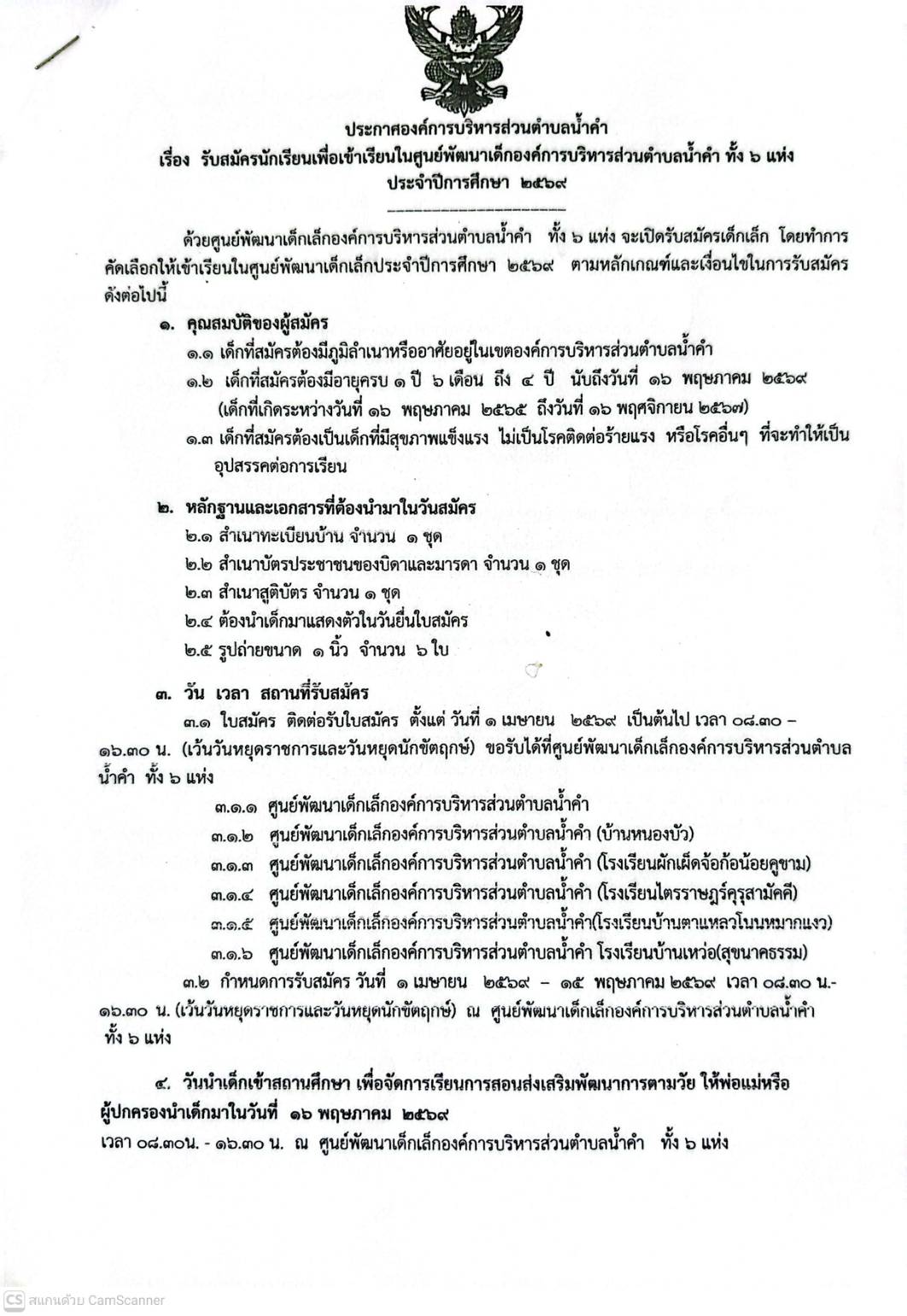 ประกาศองค์การบริหารส่วนตำบลน้ำคำ เรื่อง รับสมัครนักเรียนเพื่อเข้าเรียนในศูนย์พัฒนาเด็กเล็กองค์การบริหารส่วนตำบลน้ำคำ ทั้ง 6 แห่ง ประจำปีการศึกษา 2569